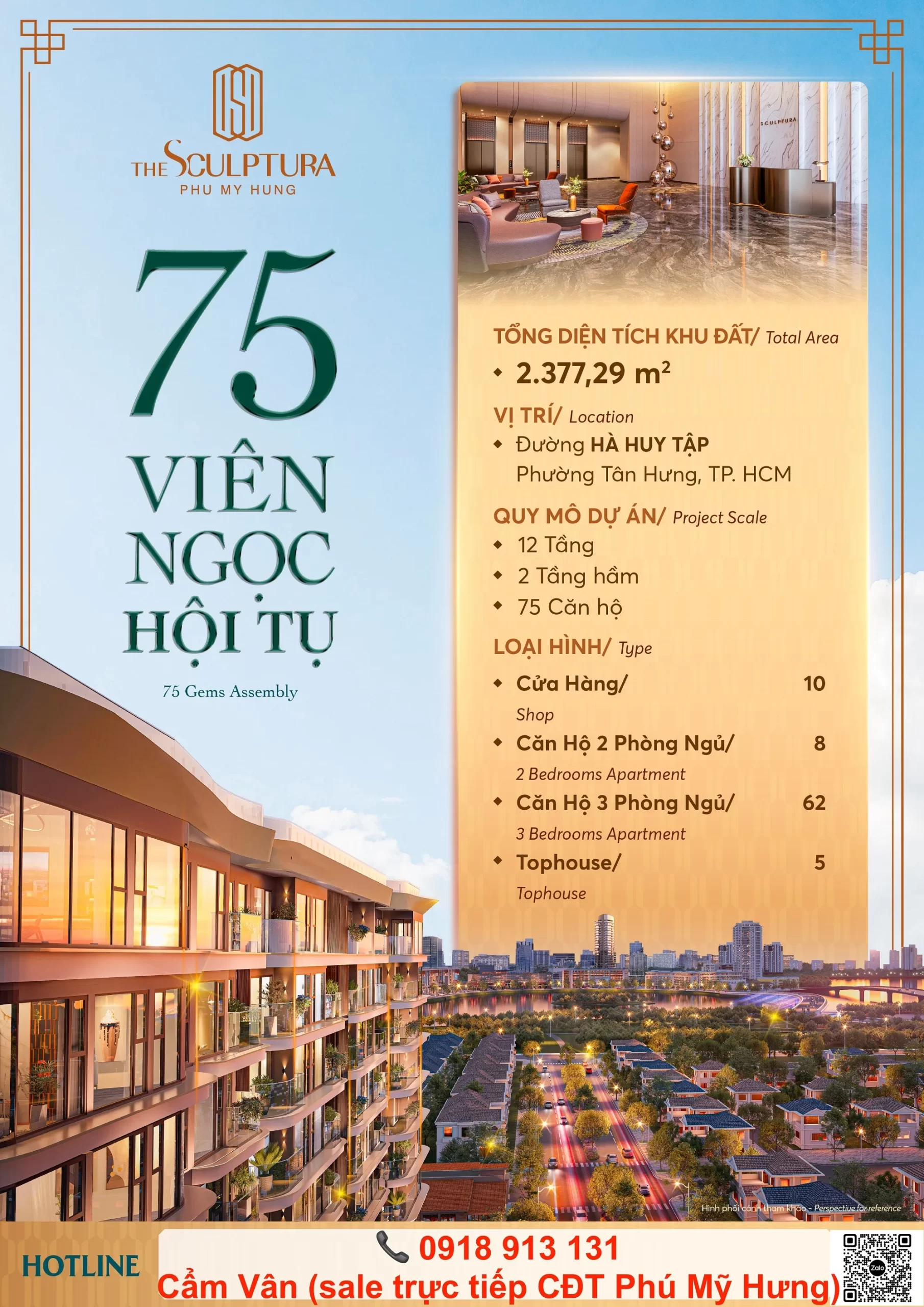 The Sculptura Phú Mỹ Hưng tọa lạc tại lô H14-3 đường Hà Huy Tập, là dự án căn hộ chung cư cao cấp mới nhất của Phú Mỹ Hưng chính thức ra mắt vào cuối năm 2025. Nằm trong phân khu Cảnh Đồi đã hoàn thiện, dự án mang đến một phong cách sống tinh tế, kết hợp giữa kiến trúc nghệ thuật và tiện ích hiện đại. Với quy mô giới hạn chỉ xây cao 12 tầng và chỉ thiết kế 75 căn hộ + 10 shophouse, The Sculptura Phú Mỹ Hưng là lựa chọn độc quyền dành cho giới tinh hoa, những người tìm kiếm không gian sống đẳng cấp và cơ hội đầu tư giá trị.