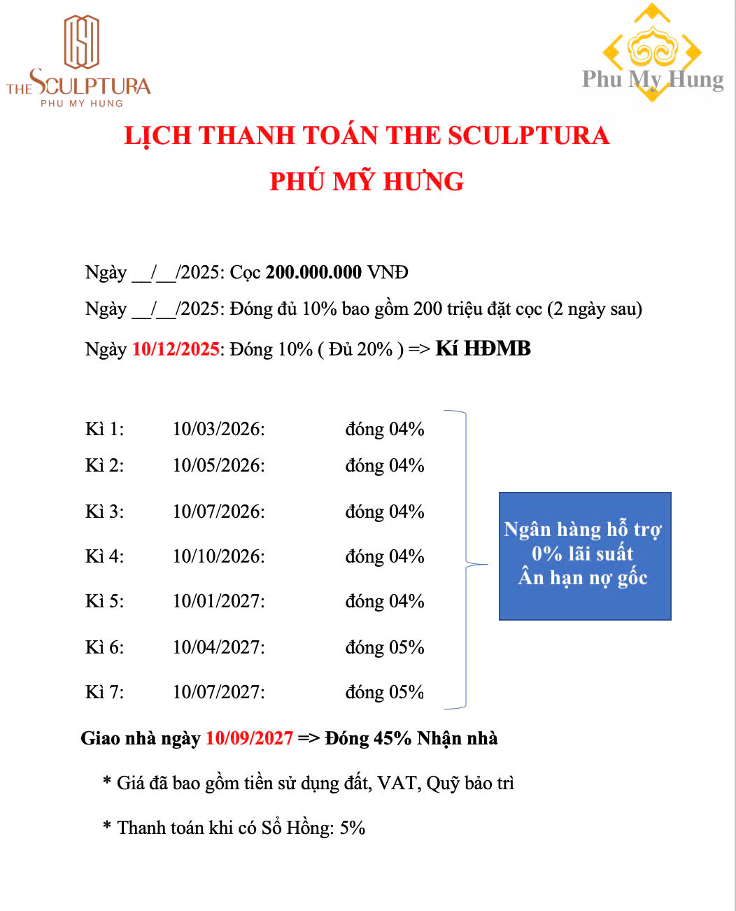 - 1 tháng sau 10/12/2025: thanh toán đủ 20% để ký Hợp Đồng Mua Bán với Phú Mỹ Hưng.